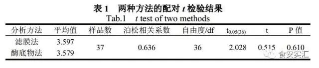 由表 1 可见,泊松相关系数为 0.636,属强相关(系数越趋于 1,相关性越好),说明两组数据的相关性很好;检验统计量 t=0.515,P=0.610>0.05,说明两组数据无统计学意义上的显著性差异,可认为滤膜法与固定底物酶底物法的试验结果具有可比性。