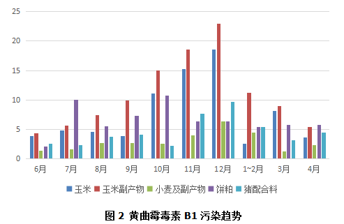 由图1可以看出,2017年4月份饲料及原料的黄曲霉毒素B1污染较轻,82份样品中,仅有5份样品超标,最高值来源于一份配合料,检测值25.52μg*kg-1,整体来说,4月份的饲料及原料黄曲霉毒素B1,安全级别中等。从历史数据来看(图2),2017年4月份黄曲霉毒素B1污染变化趋势不大。