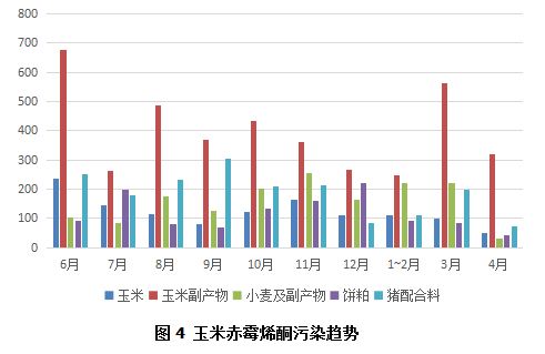 由图3可以看出,2017年4份玉米副产物的玉米赤霉烯酮平均值高于其它原料,但污染程度不高,低于国家最高标准,其余原料平均值较低,污染程度低。由历史数据可以看出(图4),2017年4月玉米副产物污染趋势保持,总体变化不大,污染轻。