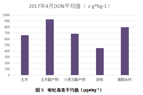 由图5可以看出,2017年4月份玉米副产物的呕吐毒素偏高于其余几种原料,有2份玉米副产物的呕吐毒素超过2000μg*kg-1,玉米及小麦的呕吐毒素平均污染水平不高,但局部地区的玉米及小麦的呕吐毒素超标现象仍然存在,仍需注意。从历史数据可以看出,呕吐毒素污染情况与3月份类似,变化不大,污染程度中等。
