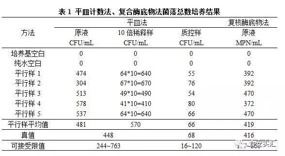 对于平皿计数法与复合酶底物法优越性比较,平皿计数法是传统的检测方法,低成本、应用时间长、技术成熟,对操作环境的卫生条件要求高,需要在无菌室内操作;复合酶底物法是近年开法出来的新方法,操作简单,在普通的实验室内也可以进行培养,多次质控样的结果,复合酶底物法比平皿计数法更接近样品真值,但实验用的培养基培养皿等材料成本较高。
